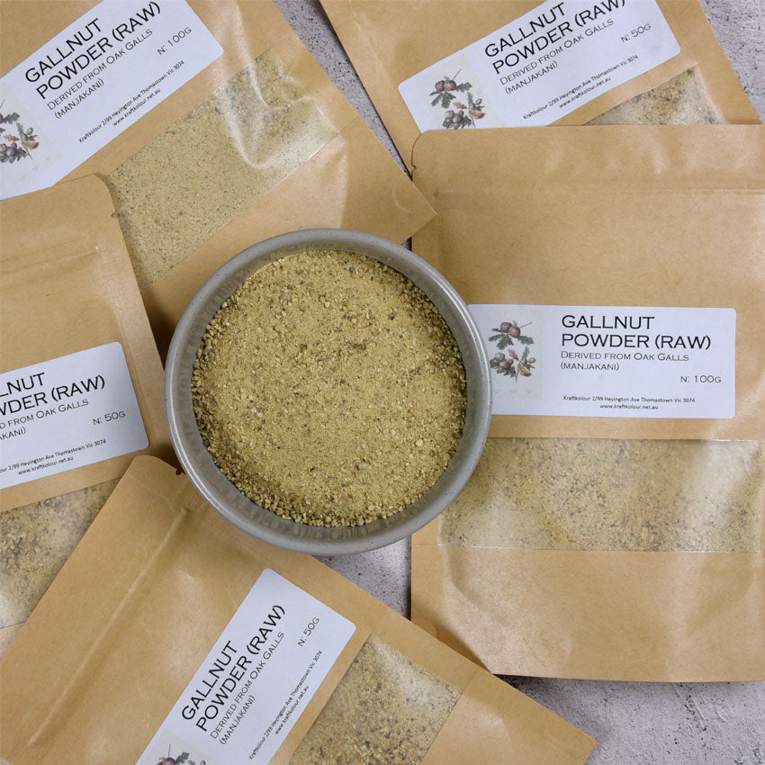 Gallnut Powder is derived from Oak Galls, which are produced by Oak trees as a defence against insects that deposit their eggs in small punctures they make on young branches. The tree excretes a tannin-rich gum, which hardens and becomes gallnuts. This is the earliest source for natural tannin and is a colourless powder used to mordant cellulose before adding Alum. This helps the Alum bond with the fibre.