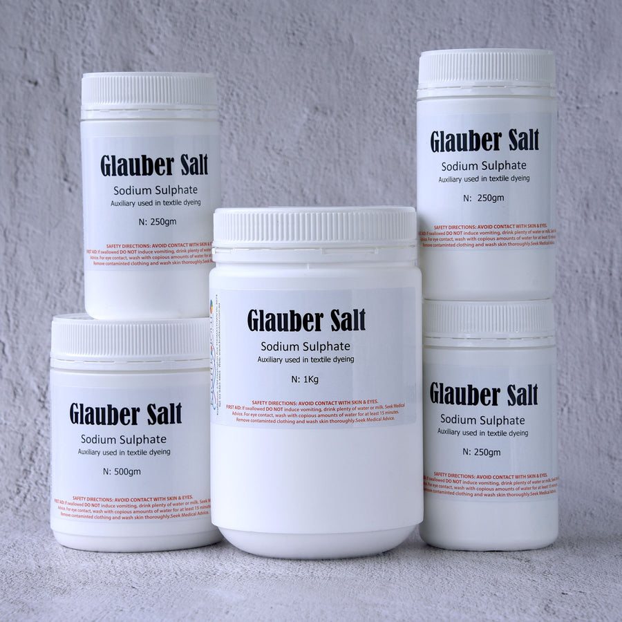 Glauber Salt (Sodium Sulphate) is essential for dyeing with reactive dyes, especially turquoise shades, as it improves colour absorption and ensures even dye uptake. Unlike regular table salt, it is pH-neutral, free from iodine, and does not alter the fabric’s texture (hand).