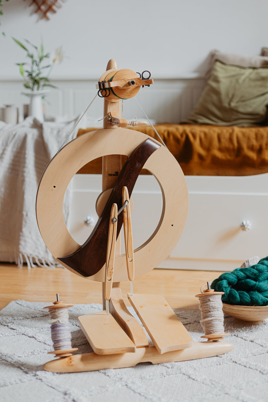 The flyer is held on by a super-strong rare earth magnet but easily releases with a sharp pull, granting easy access to the bobbin and allowing for very fast changes without needing to remove the drive band. The flyer and wheel rotate on sealed ball bearings, making spinning on this wheel smooth, quiet and effortless.