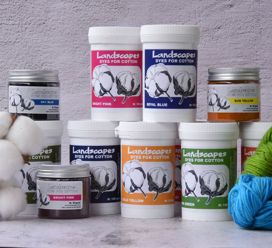 Landscapes Dyes for Cotton - 24 bright clear colours which will dye any cellulose fibre, yarn or fabric in hot water. Simple one pot dyeing method using hot water and cooking salt. All colours are intermixable. Good light and wash fastness which can be improved with an aftersoak bath.