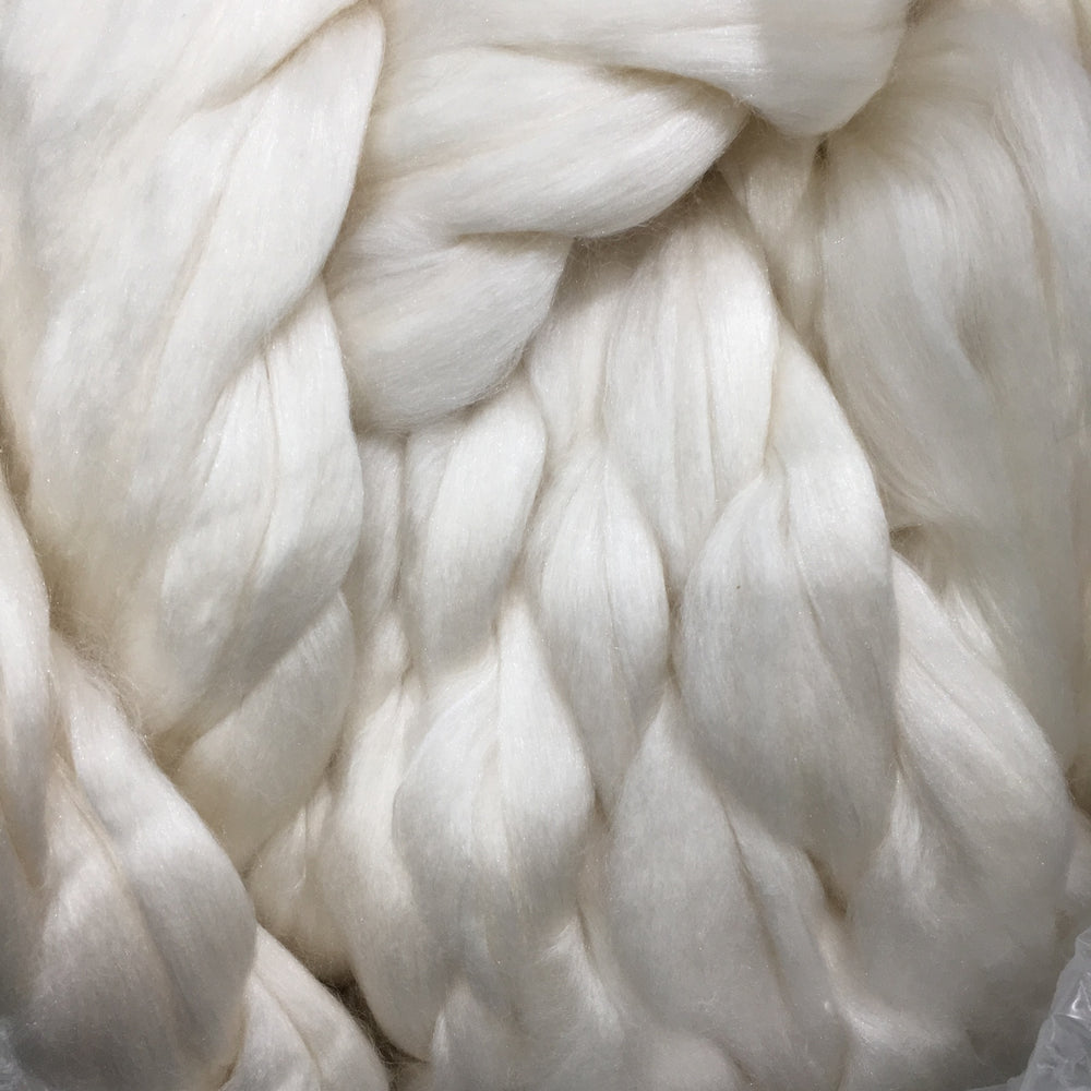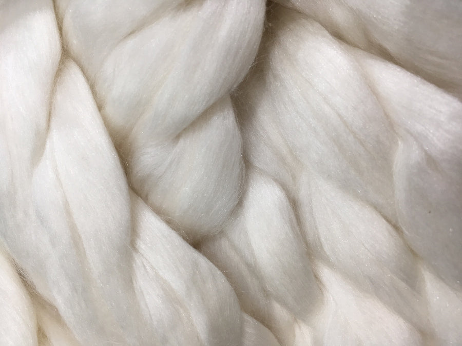 An exquisite blend of 50% White 17 micron Wool & 50% White Mulberry Silk for spinning & felting. This fibre is the ultimate in softness.