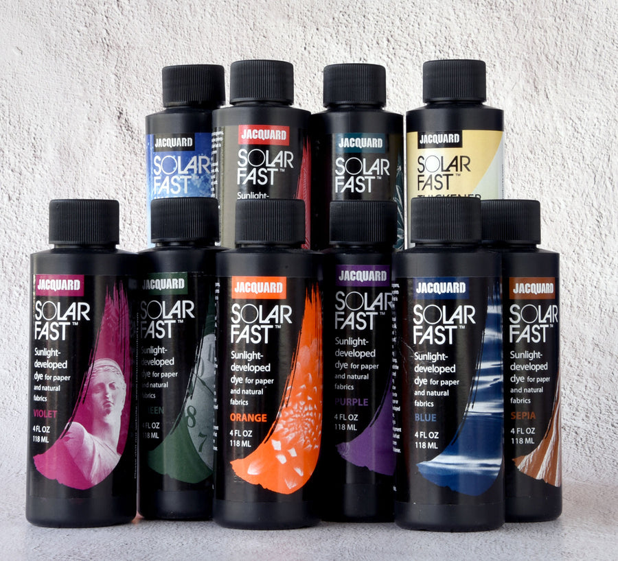 Apply SolarFast to fabric or paper using a brush, sponge or brayer. While still damp, expose the design to sunlight and watch the colour magically appear! Place objects on coated substrate to block development during exposure. Any object that casts a shadow will create a pattern. Use a film negative to create permanent photographs on paper or fabric. After exposure, wash out undeveloped dye with SolarFast Wash and hot water, agitating vigorously. Machine washing is recommended for textiles. Colour development is not complete until after washing.