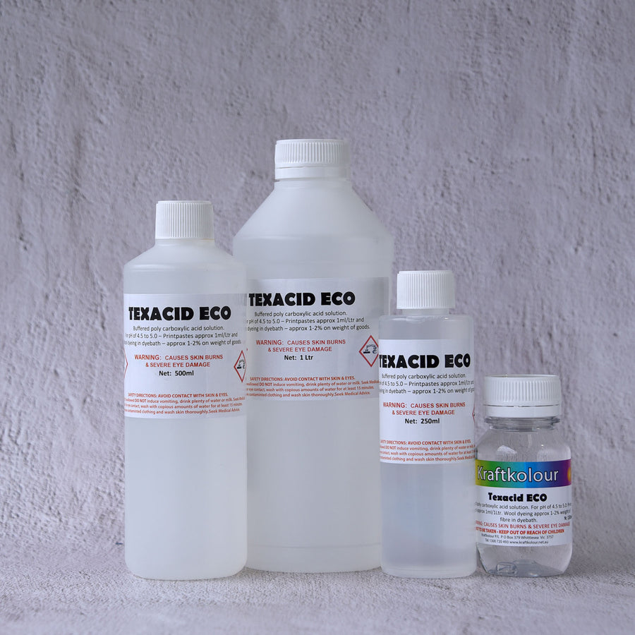 Acid dyes are commonly used on protein fibres such as wool, silk, and alpaca, as well as synthetic fibres like nylon. Without an acidic pH, the dye can’t properly fix to the fibre. Texacid Eco helps to ensure that the colours remain vibrant and washfast, resisting fading over time.